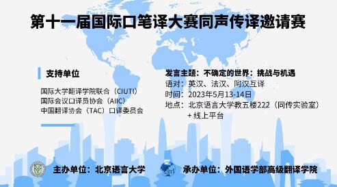第十一届国际口笔译大赛同声传译邀请赛(英汉、法汉、阿汉互译)将于2023年5月13-14日举办。