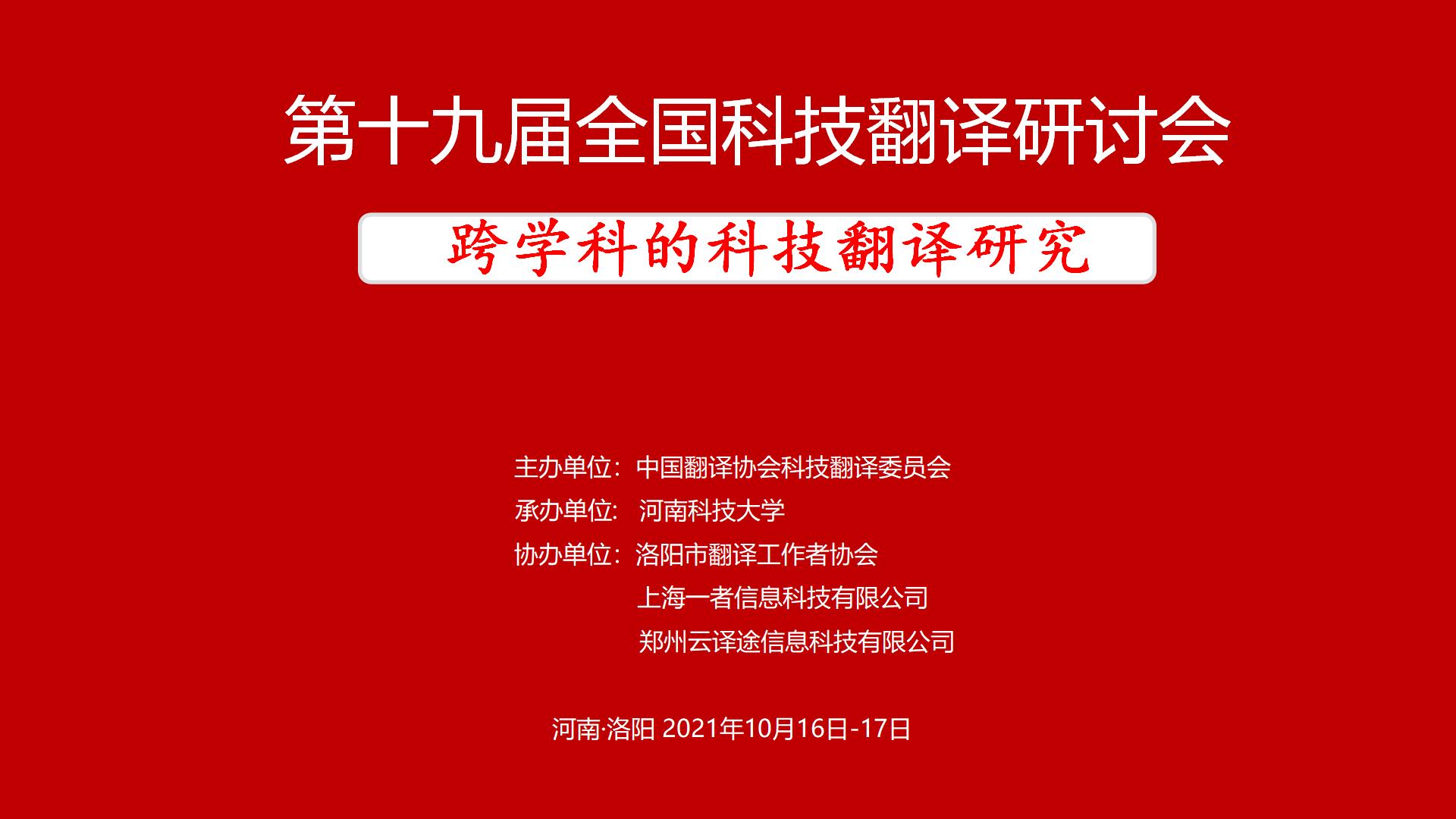 在翻译学跨学科研究的新常态下,为促进科技翻译事业的创新发展,中国翻译工作者协会科技翻译委员会主办的“第十九届全国科技翻译研讨会”定于2021年10月15-17日在河南科技大学举办,主题为“跨学科的科技翻译研究”。本次研讨会由《中国科技翻译》、《上海翻译》、《外语教学》、《解放军外国语学院学报》、《河南科技大学学报(社会科学版)》等期刊提供学术支持。会议邀请知名专家做主旨发言,评选优秀论文并进行论文宣讲,推荐高质量论文在相关期刊发表。